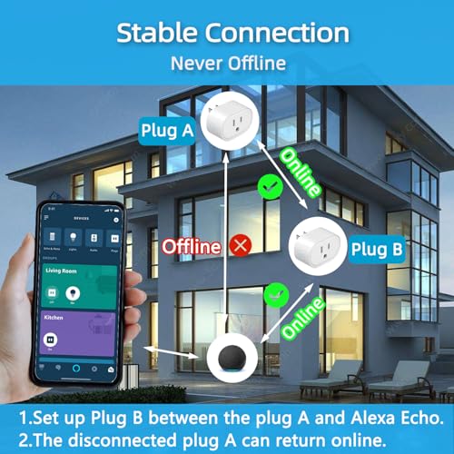Bluetooth Low Energy (BLE) Mesh plug-to-plug connection helps intelligently eliminate signal dead zones — connect multiple plugs to extend your voice control capabilities beyond signal dead zones, each BLE Mesh plug acts as its own hub beyond the Echo.