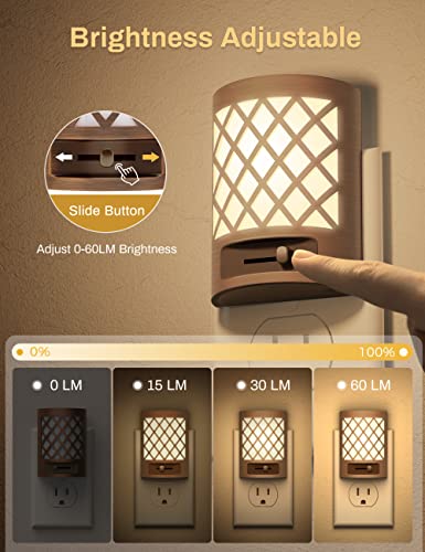 DUSK TO DAWN SENSOR NIGHT LIGHT – Nightlight with Light sensing technology automatic turns the night light off during the day and on at night. The nightlight slide dimming button to adjust from 0lm to 60lm dimming brightness adapts to different locations in your need.